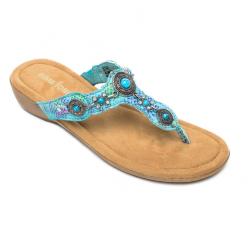 Minnetonka Sandalen aus weichem Wildleder mit Metallapplikationen. Die gepolsterte Innensohle und flexible Laufsohle garantieren höchsten Tragekomfort.